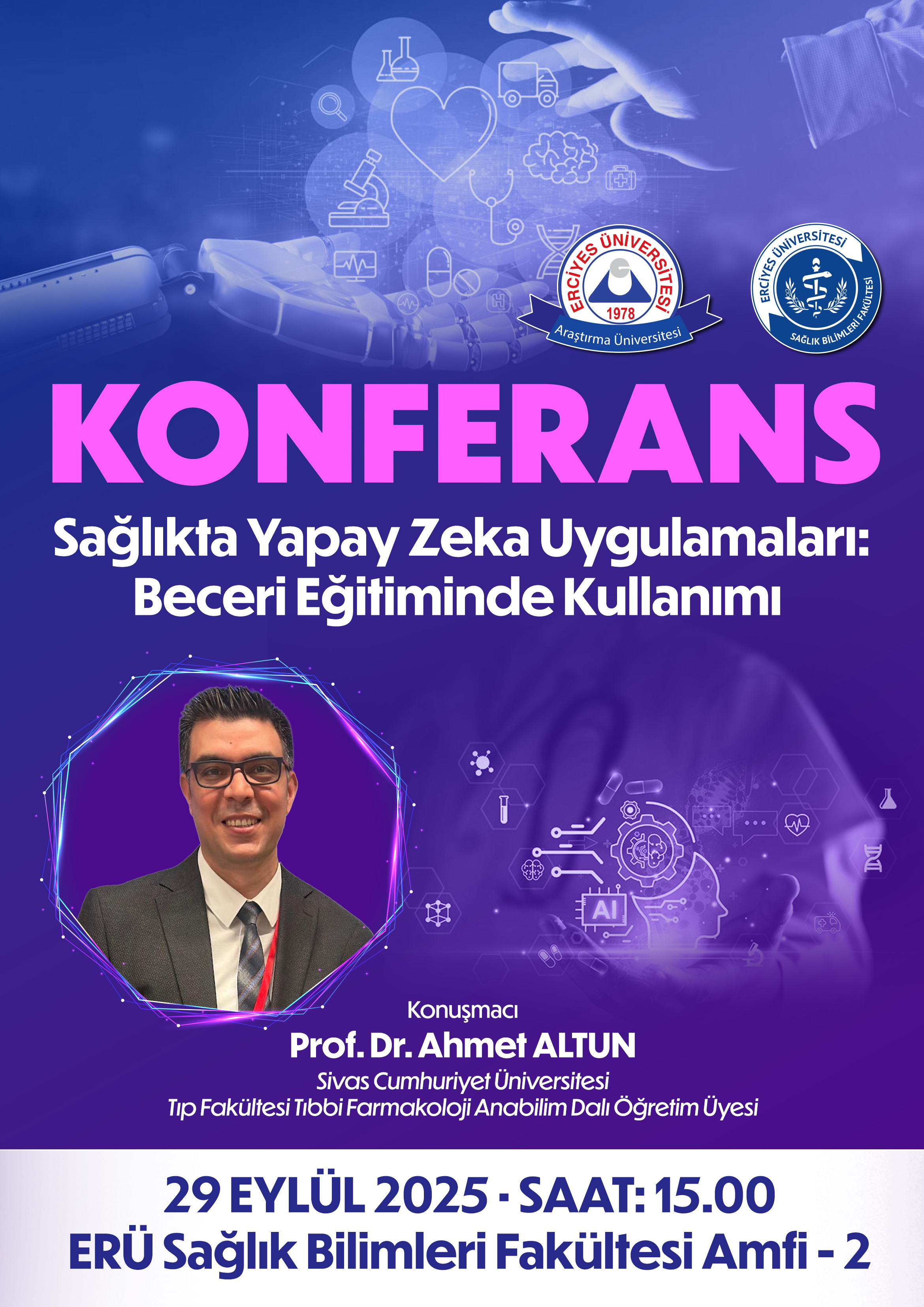 Sivas Cumhuriyet Üniversitesi Öğretim Üyesi Prof. Dr. Ahmet Altun " Sağlıkta Yapay Zeka Uygulamaları: Beceri Eğitiminde Kullanımı" konferansını 29 Eylül Pazartesi Saat 15.00'da ERÜ SBF Amfi 2 'de yapacaktır.