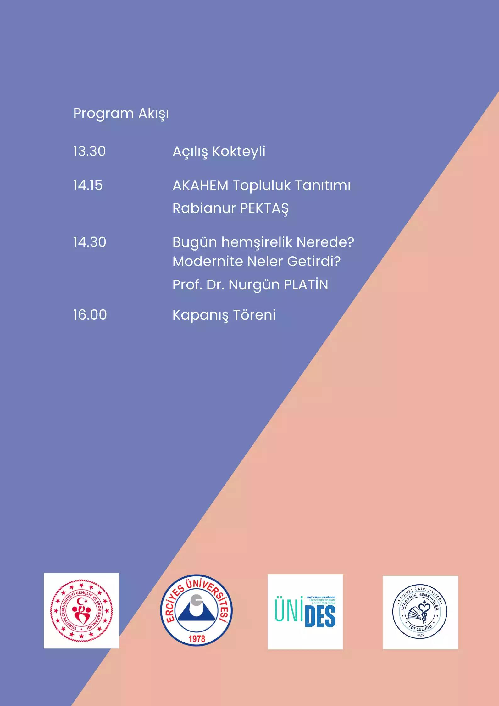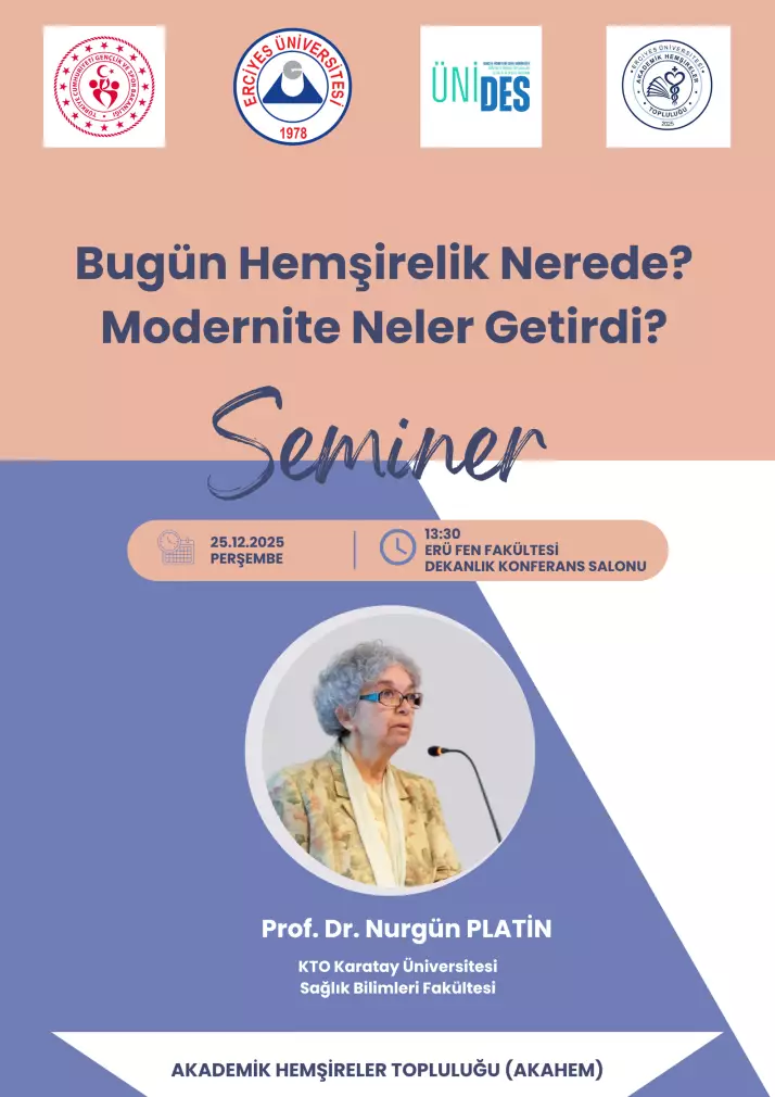 Erciyes Üniversitesi Akademik Hemşireler Topluluğu (AKAHEM) tarafından düzenlenen, hemşireliğin günümüzdeki konumunu ve modernitenin mesleğe getirdiği dönüşümleri derinlemesine ele alacağımız bilimsel seminerimize tüm öğretim üyelerimiz ve öğrencilerimiz davetlidir.