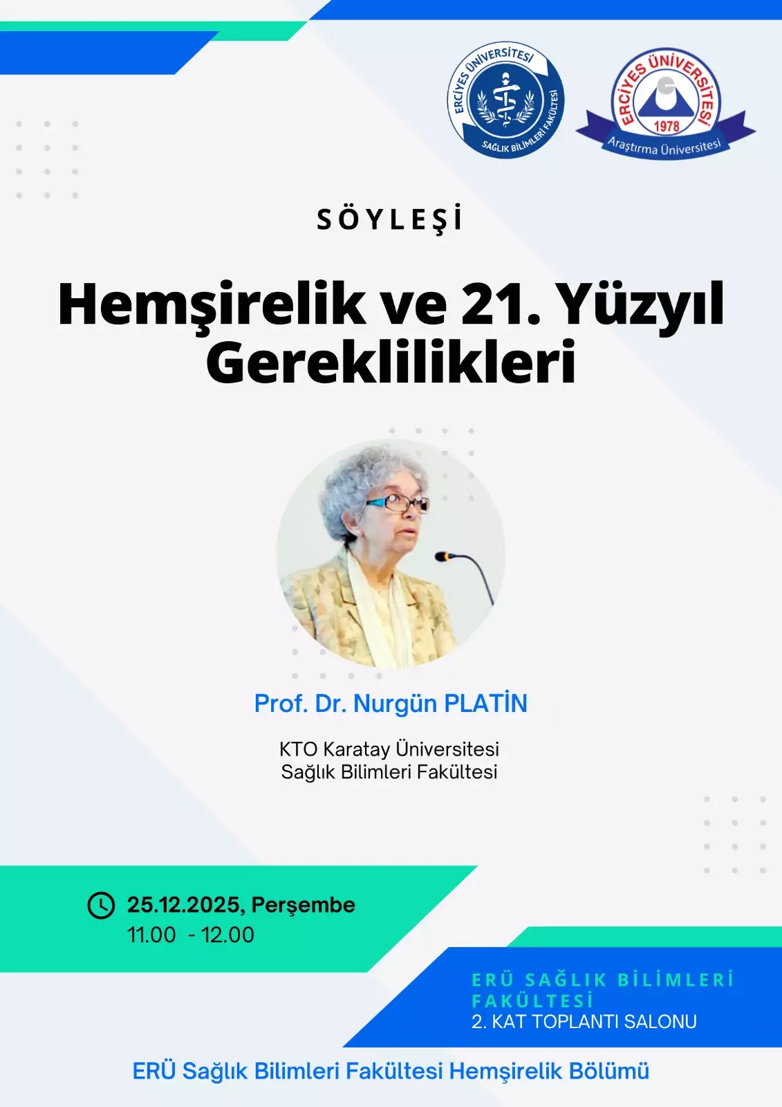 Erciyes Üniversitesi Sağlık Bilimleri Fakültesi Hemşirelik Bölümü tarafından düzenlenen, Hemşirelik ve 21. Yüzyıl Gereklilikleri başlıklı söyleşiye tüm öğretim üyelerimiz davetlidir.