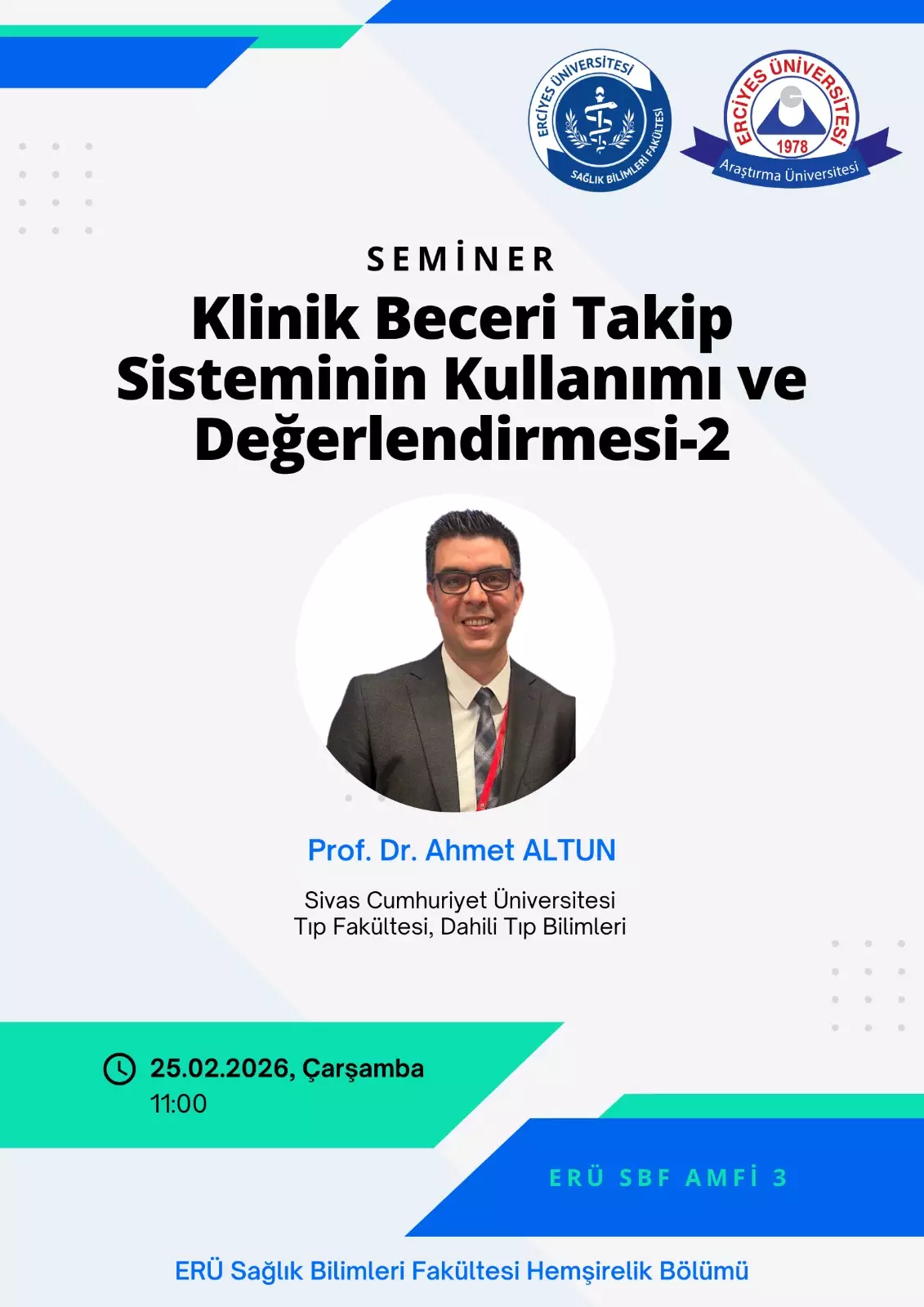 Sivas Cumhuriyet Üniversitesi Öğretim Üyesi Prof. Dr. Ahmet Altun'un katılımıyla "Klinik Beceri Takip Sisteminin Kullanımı ve Değerlendirme-2" isimli seminer 25 Şubat 2026 Saat 11.00'da ERU SBF AMFİ 3'te gerçekleştirilecektir.